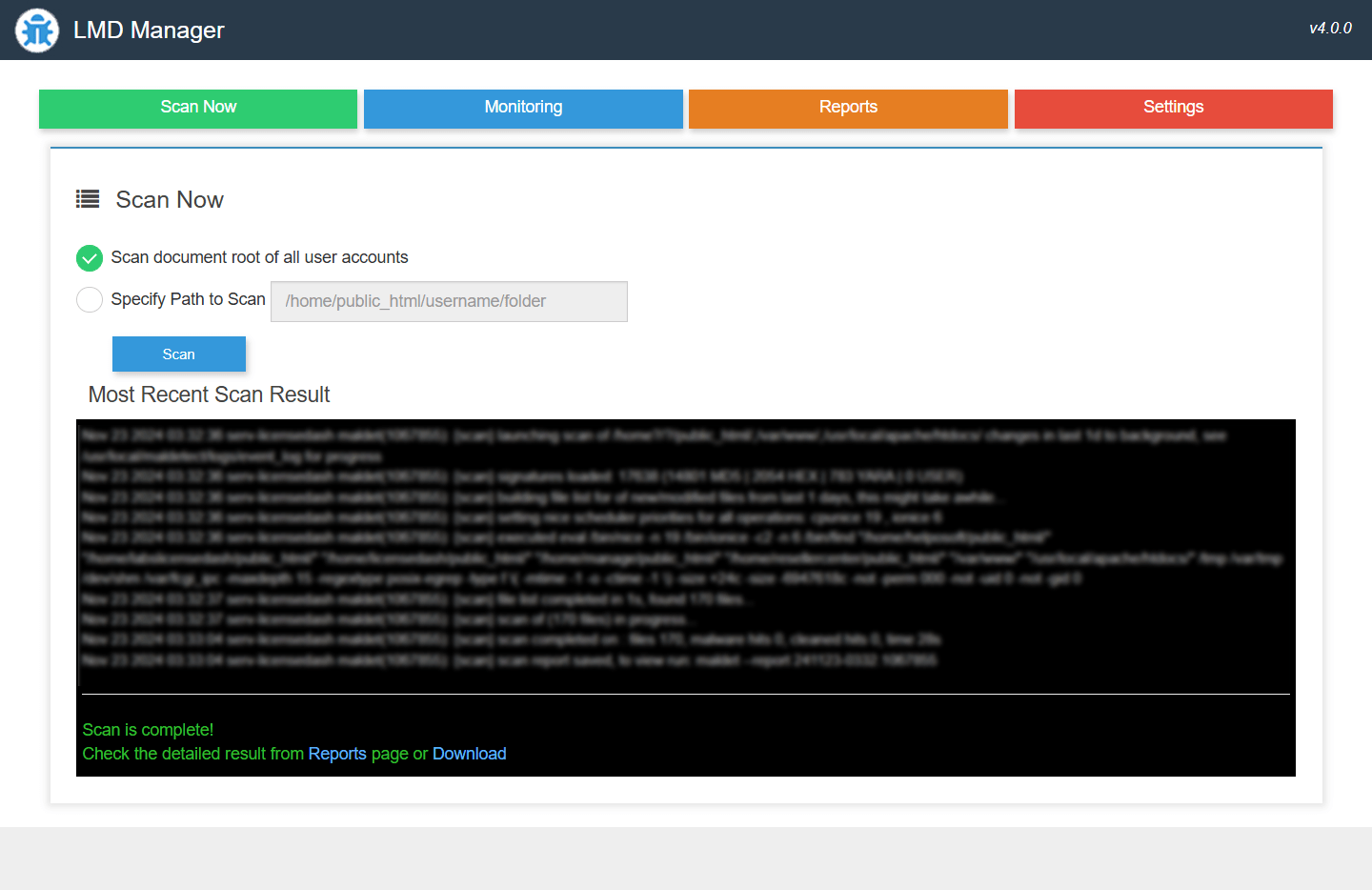 LMD generates detailed scan reports that you can easily view through your WHM interface. The reports will provide information on the files scanned, the types of threats detected, and actions taken (such as removal or quarantine). These reports help you track the security status of your server.